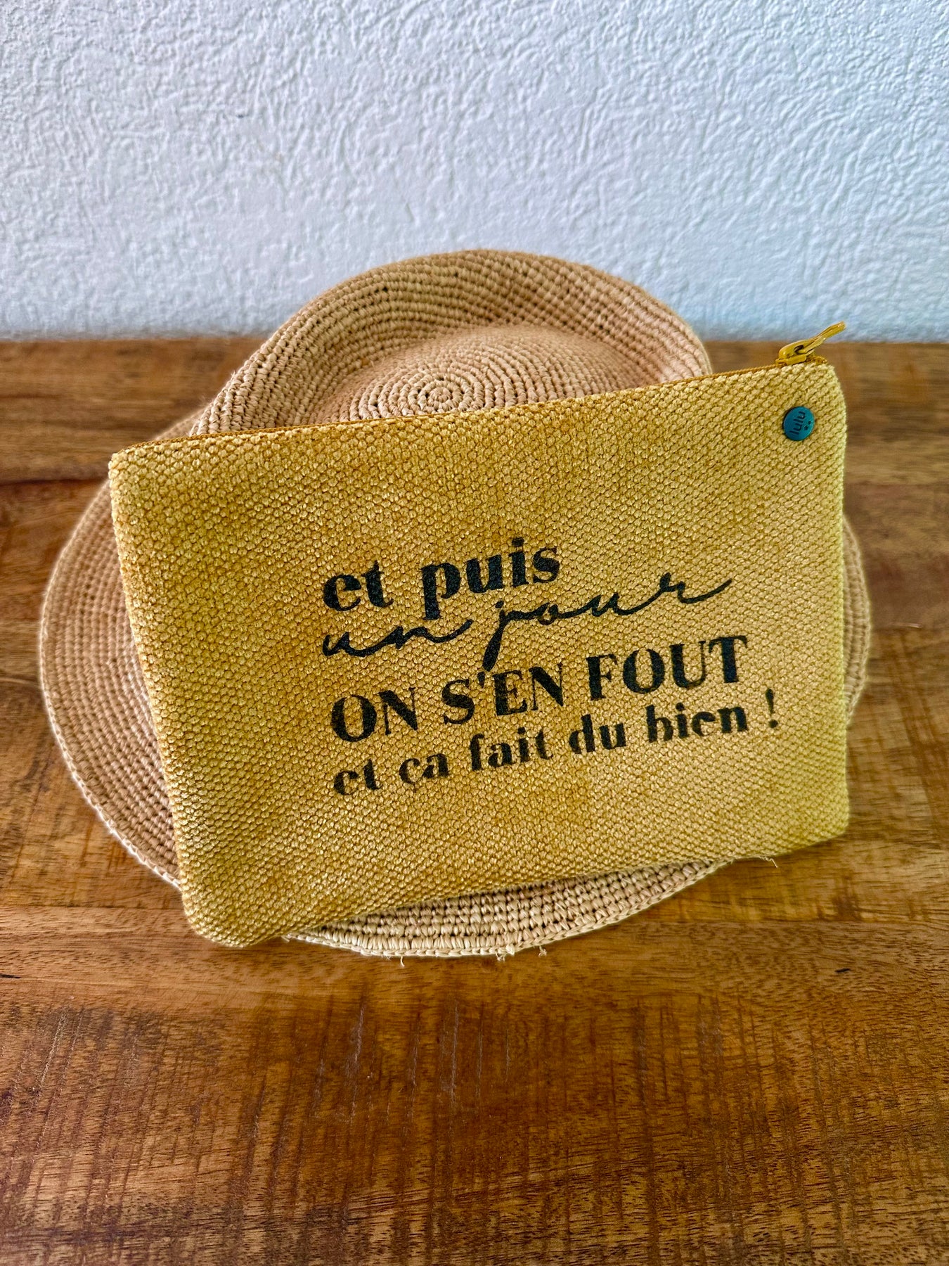 Gardez vos essentiels à portée de main avec style grâce à cette trousse de la marque Lulu en Provence, confectionnée en France. L'inscription "Et puis un jour on s'en fout et ça fait du bien" ajoute une touche d'humour et de caractère, rendant cette trousse unique. Fermeture zip. Parfaite pour votre sac à main, une escapade de week-end ou pour faire un cadeau original. Elle est disponible en coloris.