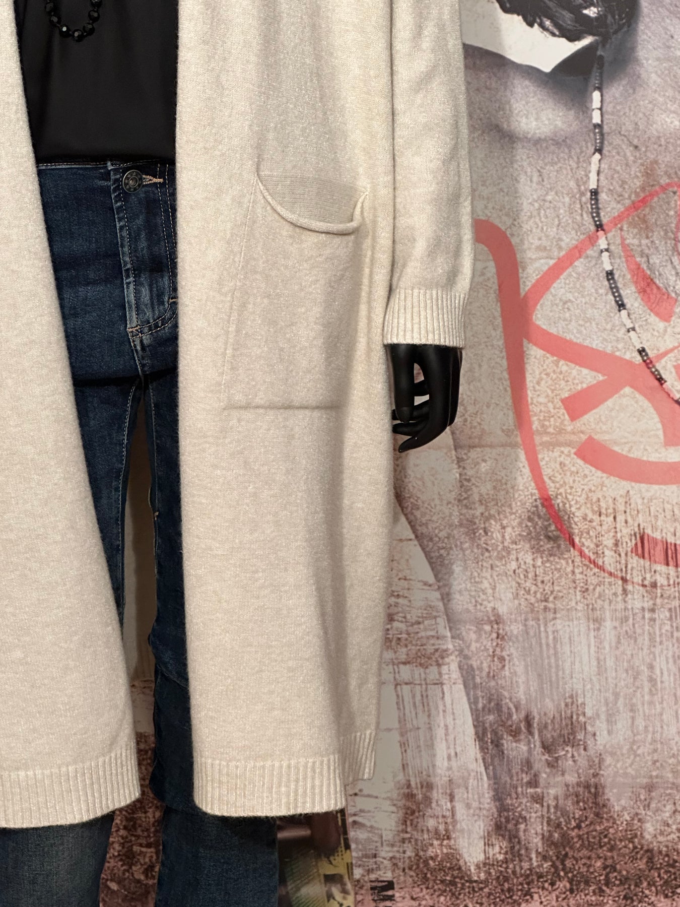 Découvrez ce superbe gilet long de couleur unie ultra doux, parfait pour ajouter une touche de confort et d'élégance décontractée à votre garde-robe. Coupe longue et droite. Manches longues. Une poche plaquée de chaque côté. Belles finitions en mailles côtelées aux extrémités. Son style ouvert sur le devant le rend facile à superposer sur un pull, un t-shirt ou une blouse, idéal pour les transitions de saison. Ne le manquez pas!