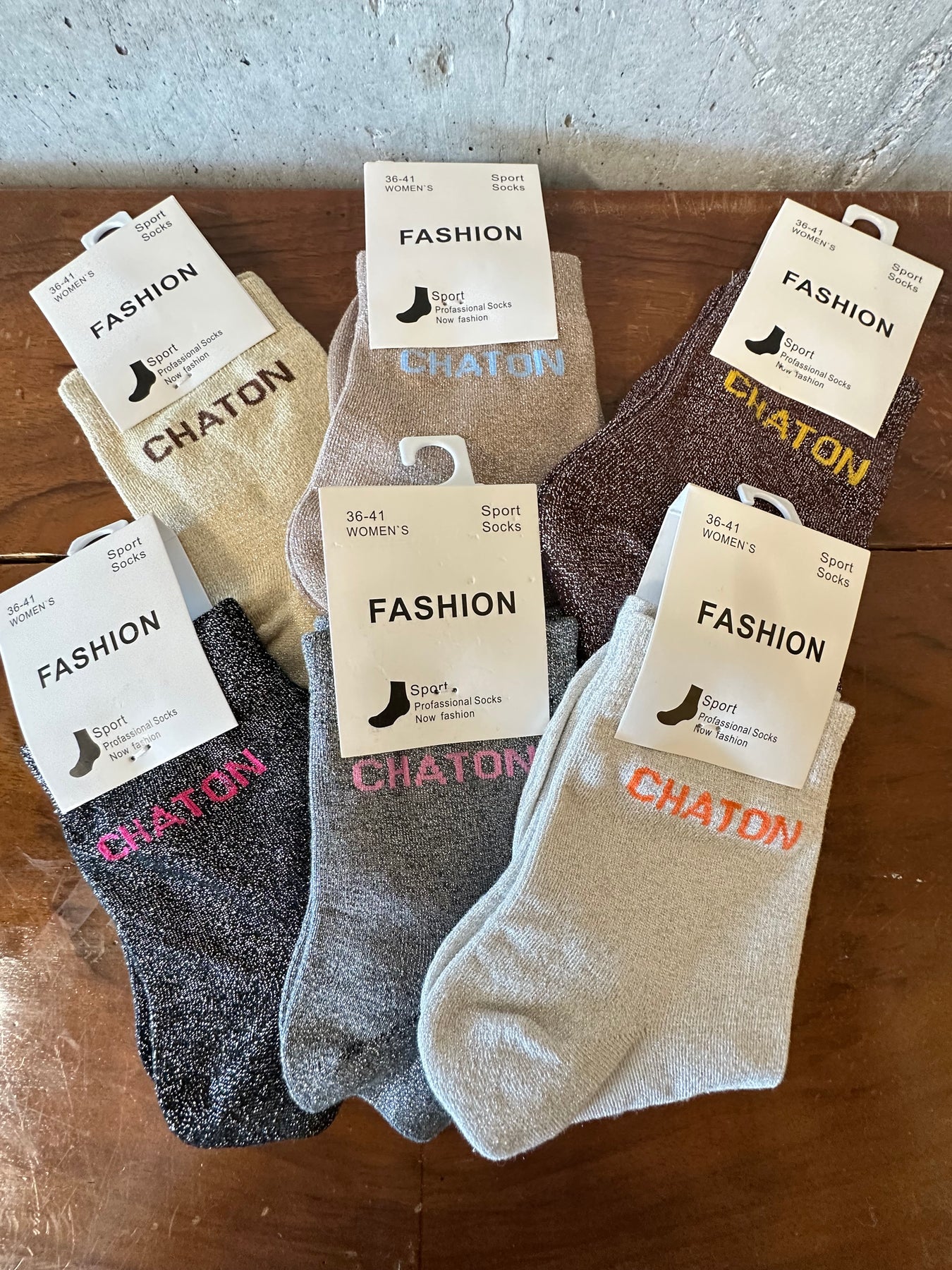 Ajoutez une touche de fantaisie à votre quotidien avec ces adorables chaussettes. Joli texte "CHATON" sur le haut. Chaque paire est pailletée argentée pour un effet lumineux subtil et très chic. Elles offrent un excellent maintien et un confort tout au long de la journée. Dispo en 6 coloris.