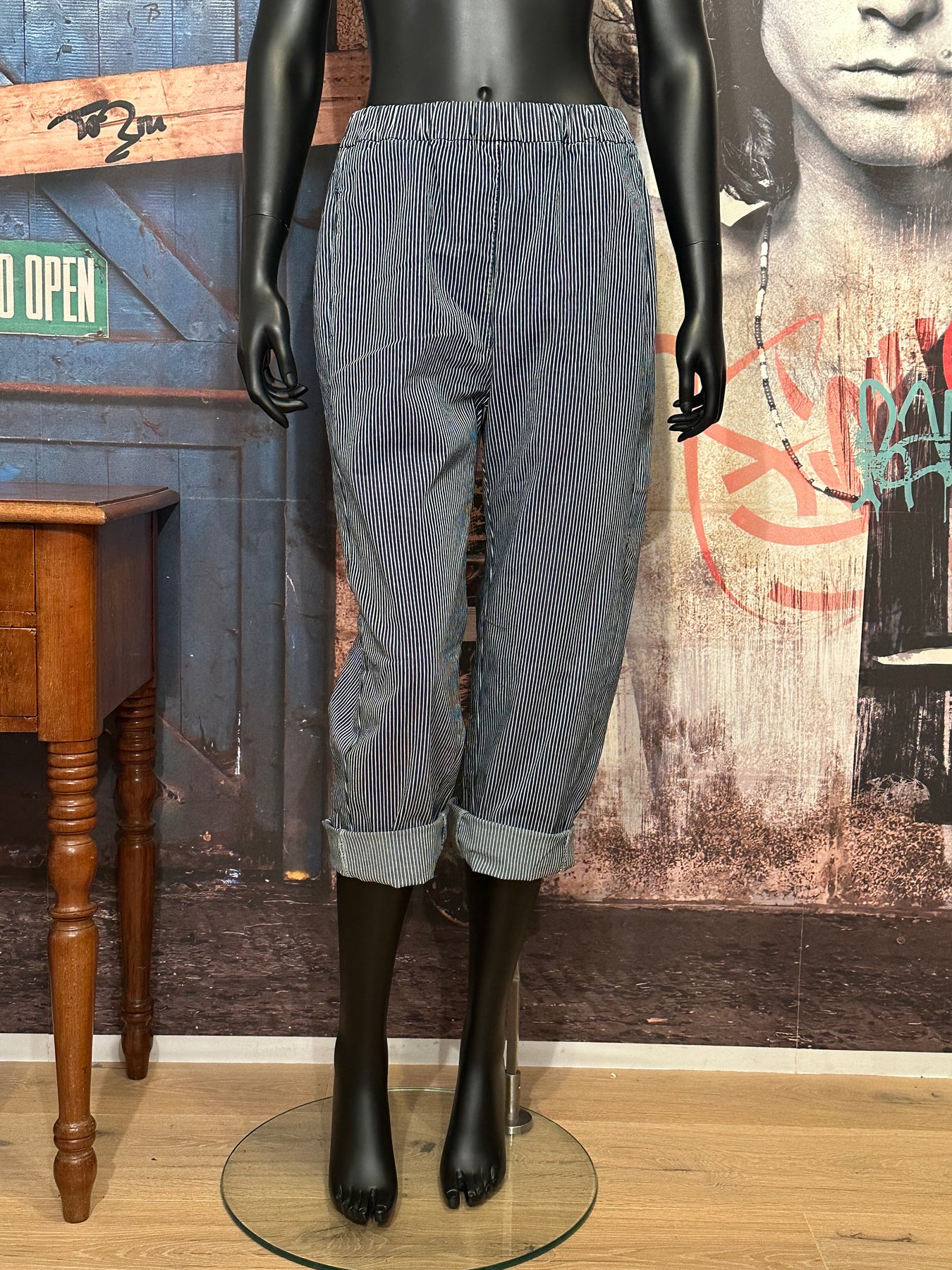 Optez pour un look chic et décontracté avec ce pantalon/jogg. Taille élastique pour un confort et un ajustement optimal. Deux poches plaquées de chaque côté. Motif à fines rayures verticales blanches & bleu marine allonge visiblement la silhouette. Coupe ample au niveau des hanches et des cuisses se rétrécissant légèrement vers les chevilles. Ce pantalon s'associe facilement avec un haut simple et près du corps pour un équilibre de volume. Un t-shirt blanc, un débardeur ou une blouse fluide s'accordent parfaitement.
