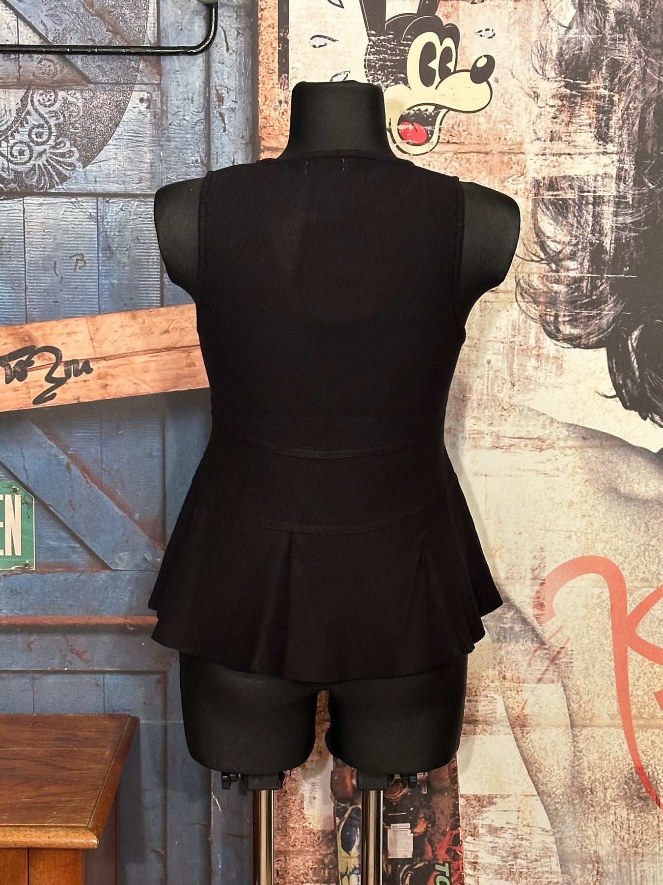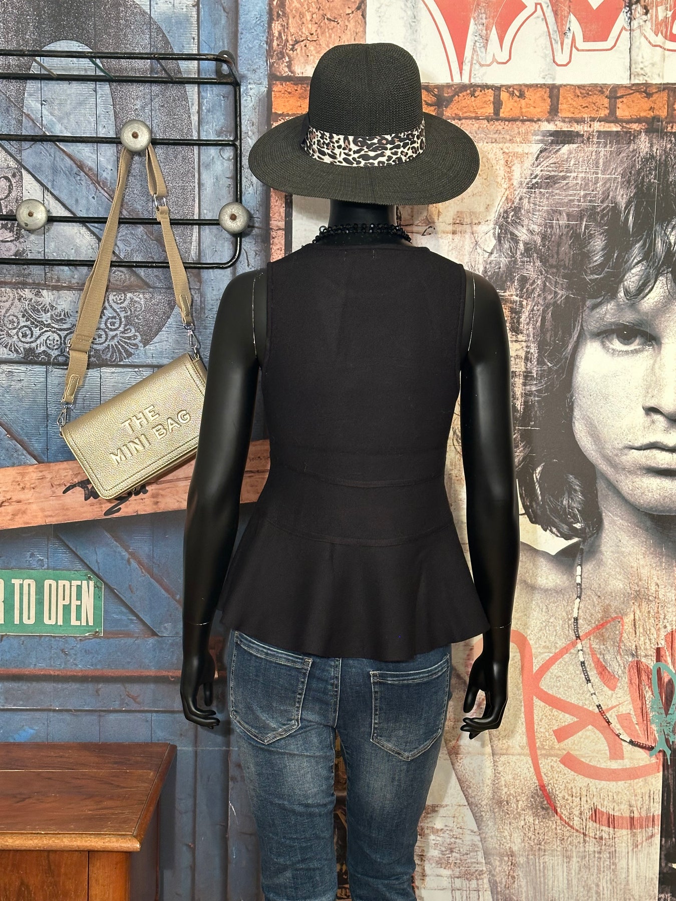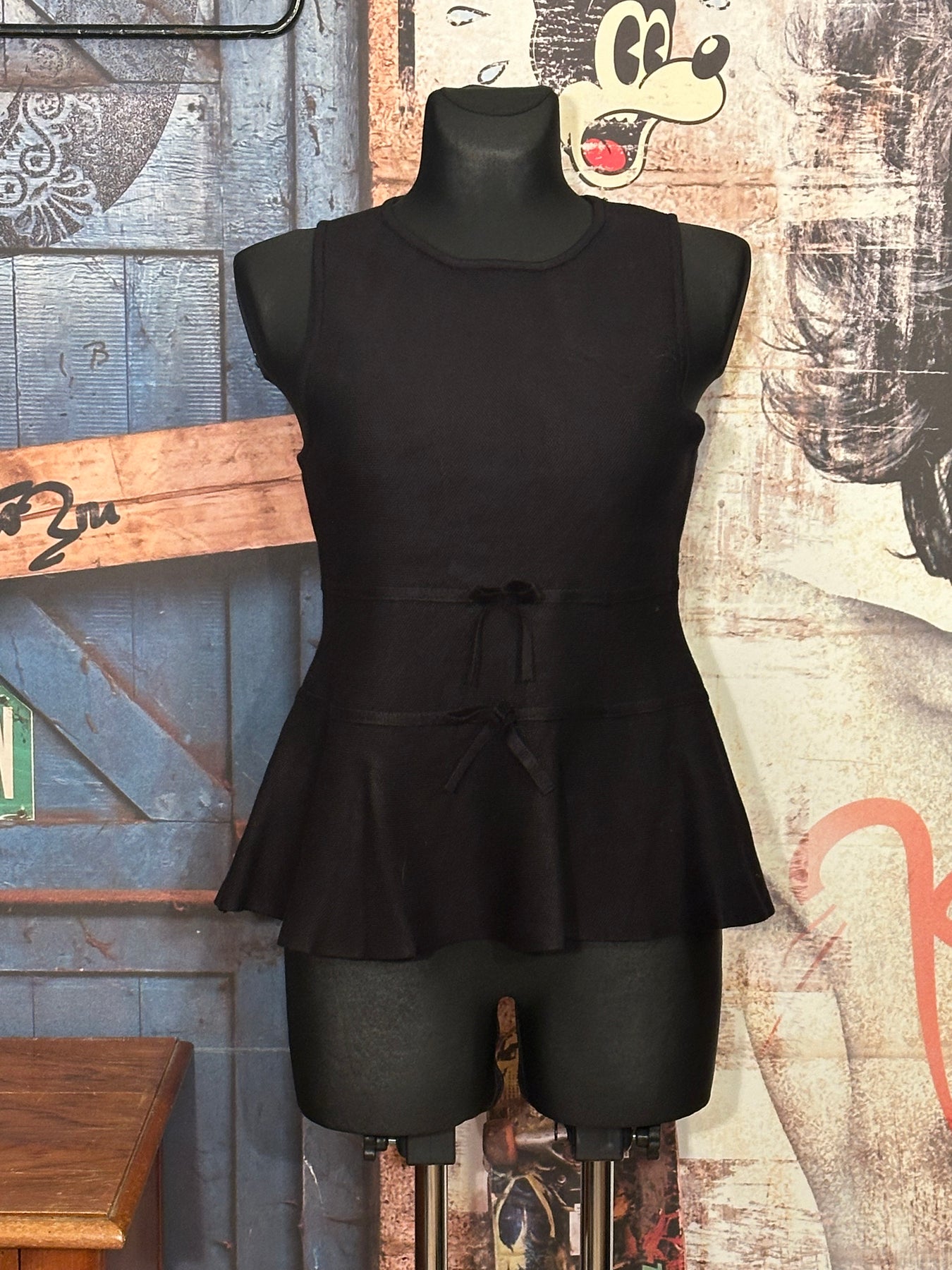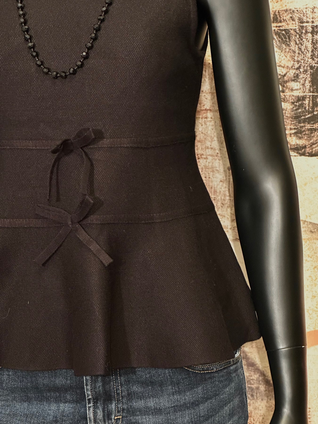 Ce haut sans manches et col rond est polyvalent et présente une silhouette à basque flatteuse qui se resserre à la taille et s'évase au niveau des hanches, créant une forme douce et féminine. Deux noeuds décoratifs sont placés sur le devant, ajoutant une touche de charme. Associez-le avec un jean pour un look chic et décontracté, ou à un pantalon de ville ou une jupe pour une tenue plus sophistiquée.