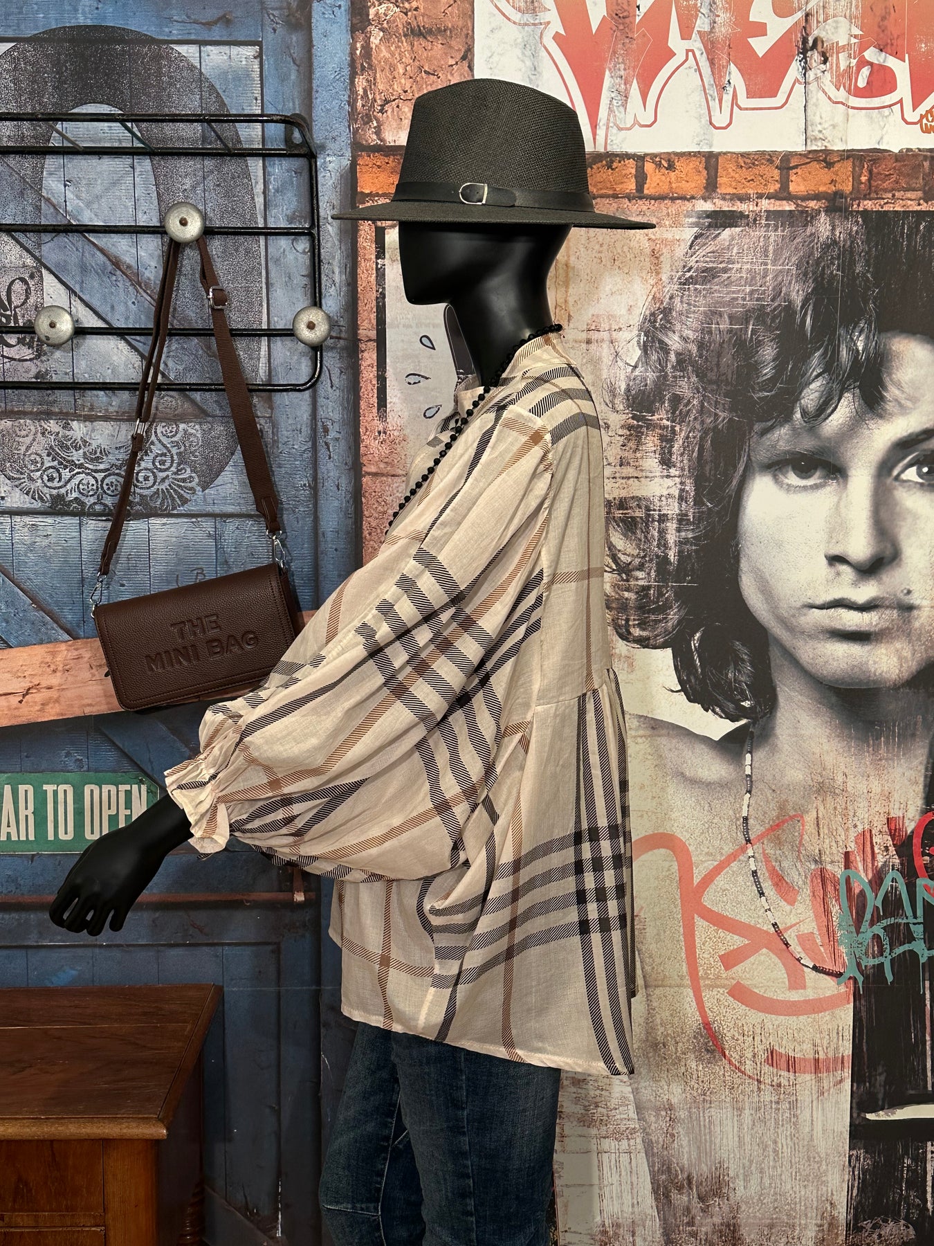 Laissez-vous séduire par cette sublime blouse en voile de coton légère et aérienne. Coupe ample, évasée et plus longue derrière. Col Mao. Patte de boutonnage partielle. Manches longues ballons se terminant avec un élastique. Magnifiques motif à "carreaux" dans les tons camel & noir sur fond beige. Légèrement en transparence. Parfaite pour une allure décontractée et élégante.