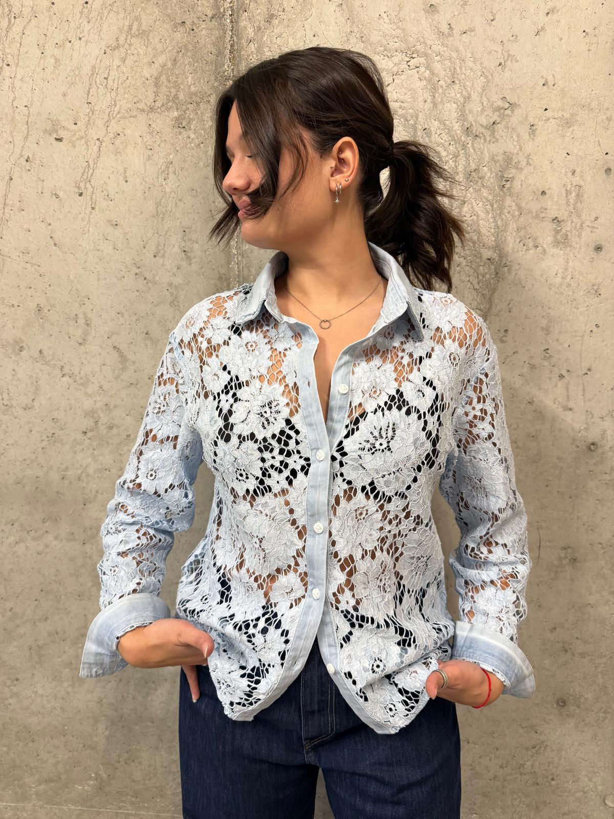 Ajoutez une touche de romantisme et d'élégance à votre garde-robe avec ce sublime chemisier intégralement confectionné en dentelle délicate. Sa couleur bleu ciel toute en  transparence et son motif floral en font une pièce polyvalente idéale pour une occasion spéciale ou pour rehausser un look décontracté.