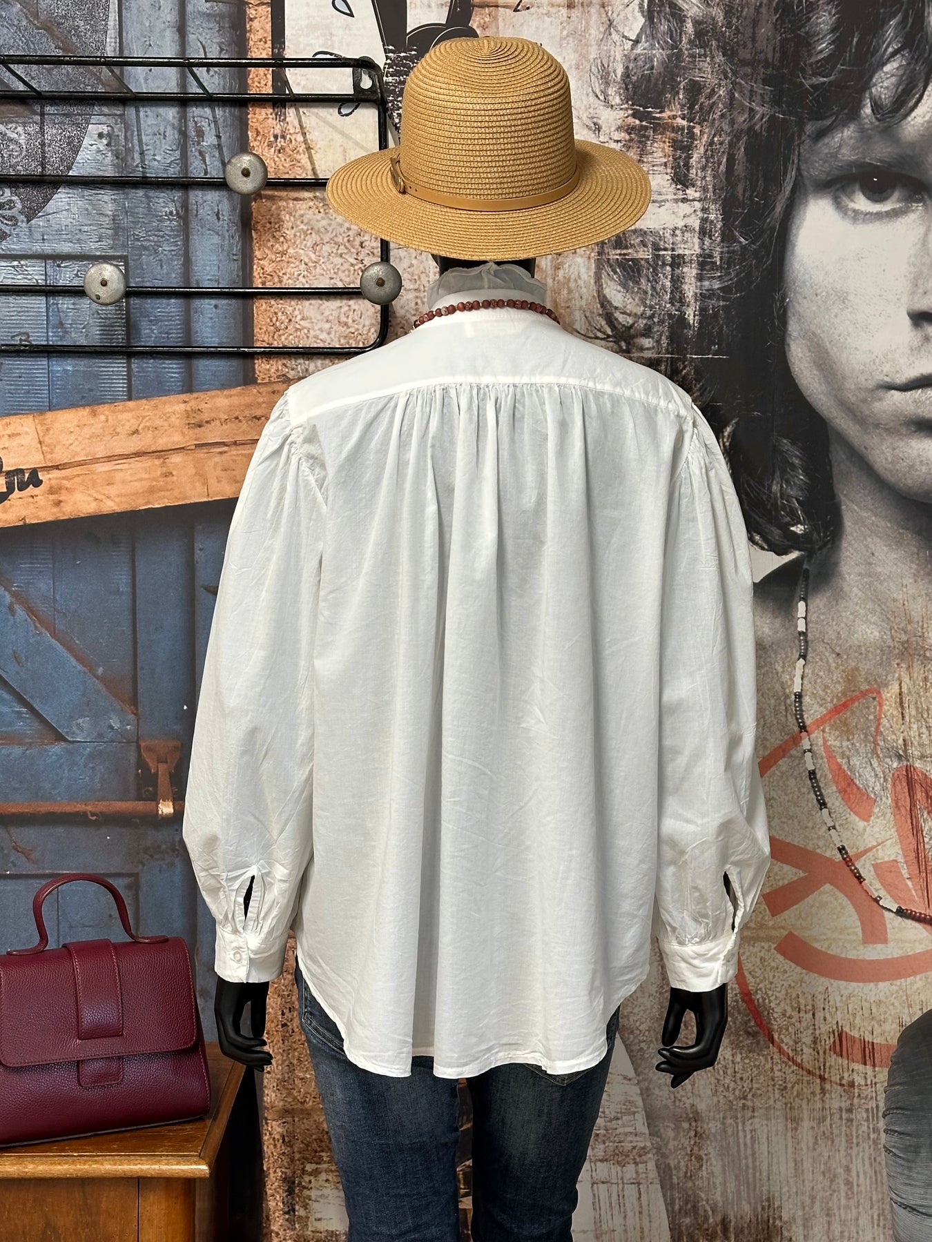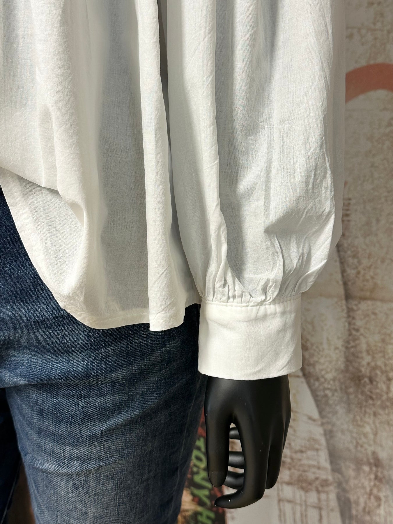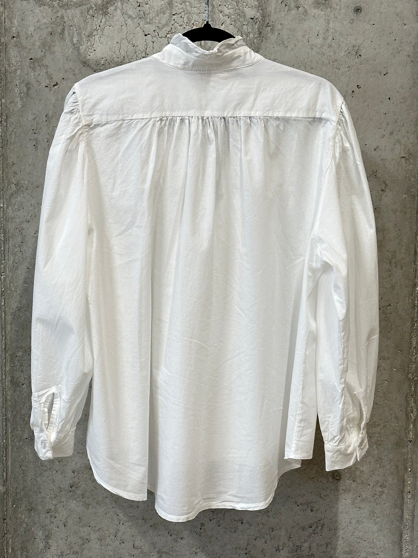 Apportez une touche de poésie et d'élégance vintage à votre garde-robe avec cet sublime chemisier blanc uni. Coupe ample, évasée et légèrement plus longue derrière. Manches longues bouffantes, fronces aux épaules pour un volume élégant, terminées par des poignets boutonnés. Col V et pattes de boutonnage ornés de délicats petits volants pour un effet aérien et féminin. Pour un look printanier parfait, portez-le avec un jean clair ou une jupe.