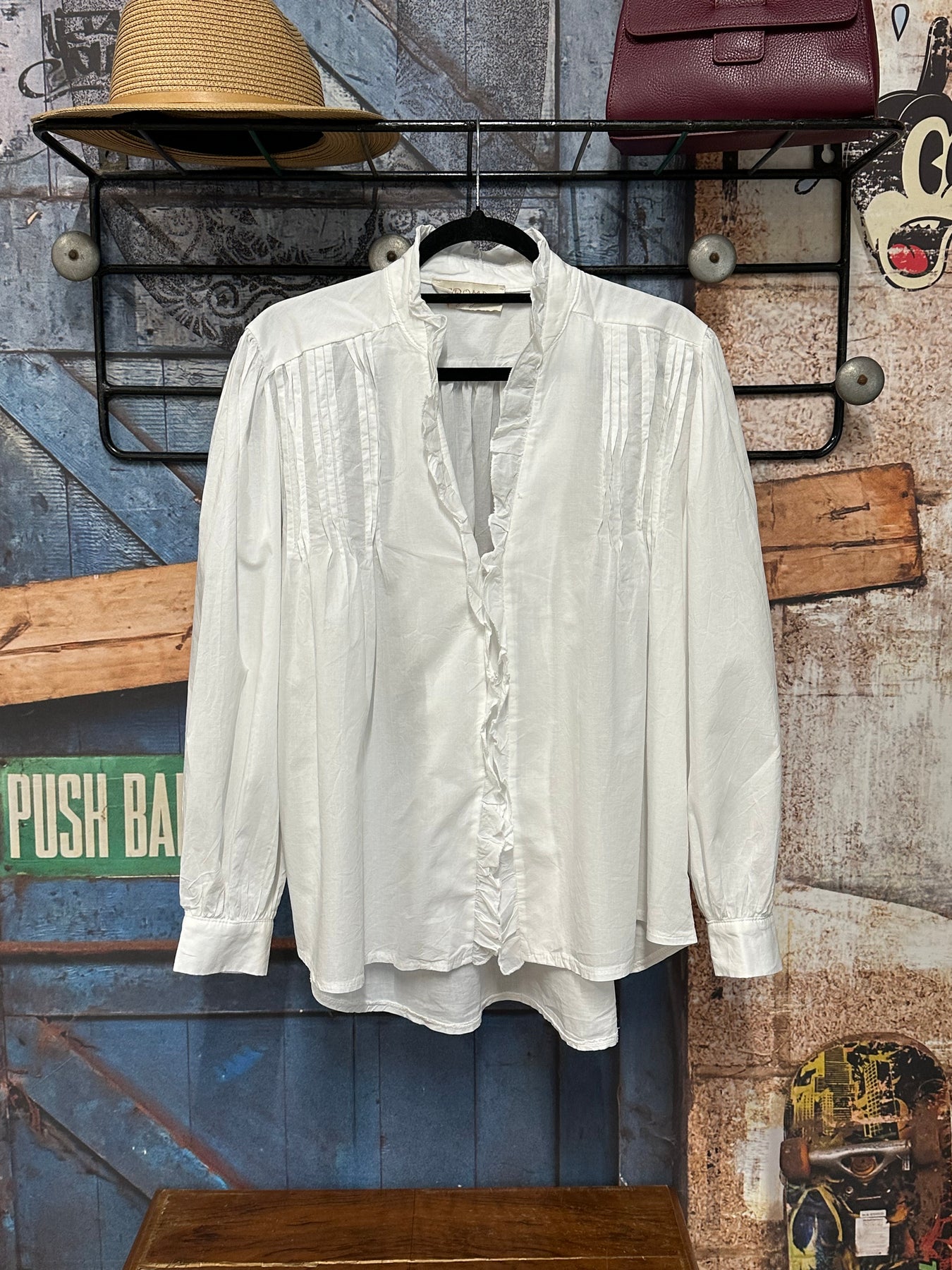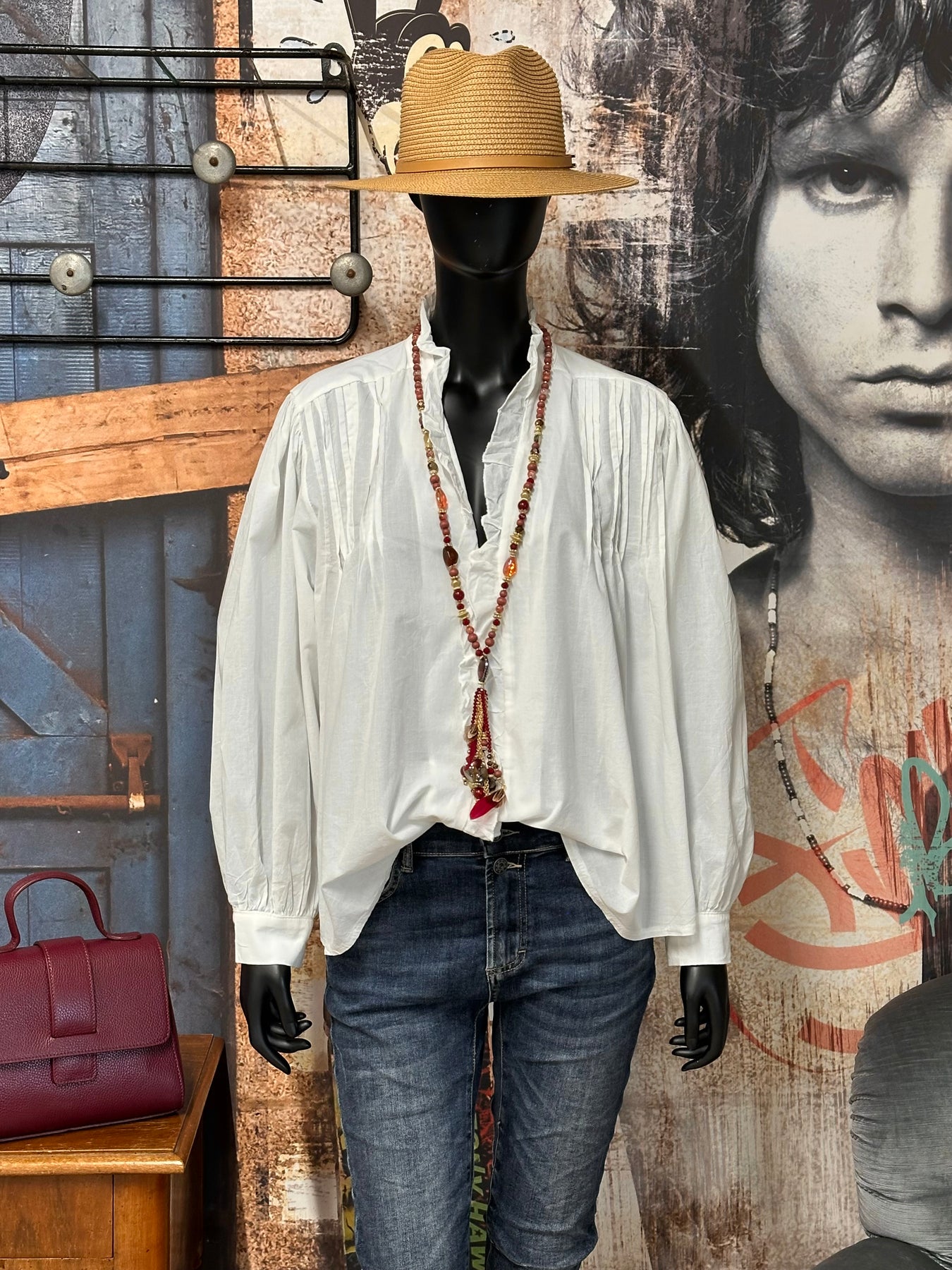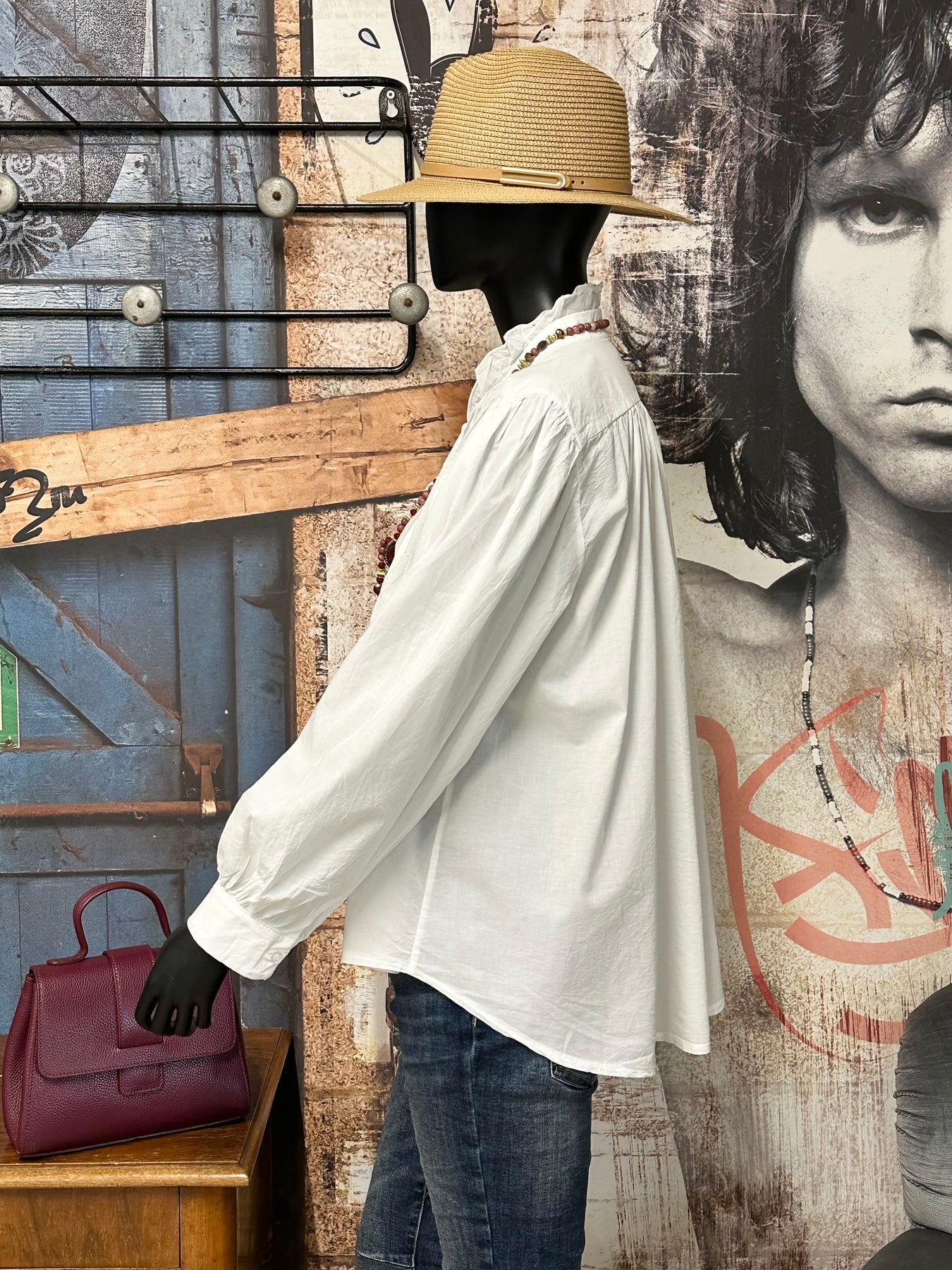 Apportez une touche de poésie et d'élégance vintage à votre garde-robe avec cet sublime chemisier blanc uni. Coupe ample, évasée et légèrement plus longue derrière. Manches longues bouffantes, fronces aux épaules pour un volume élégant, terminées par des poignets boutonnés. Col V et pattes de boutonnage ornés de délicats petits volants pour un effet aérien et féminin. Pour un look printanier parfait, portez-le avec un jean clair ou une jupe.